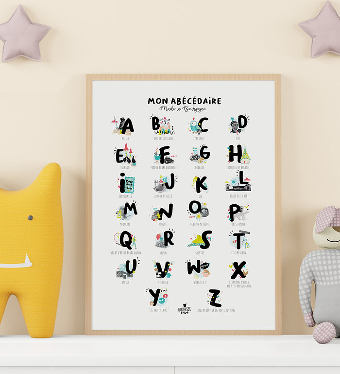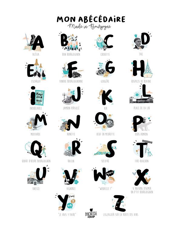 - Mon abécédaire 100% bourguignon ! A comme Alésia, G comme Gougère, V comme Vignoble… Il n’est jamais trop tôt pour s’imprégner de la culture locale ! Éducatif et décoratif, il sera parfait dans la chambre de vos p’tits Bourguignons.