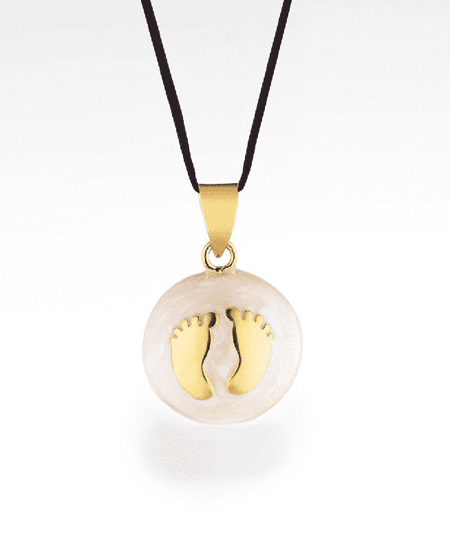 Le bola de grossesse babyfeet en émail beige/rose est décoré de petits pieds dorés à l’or fin 18 carats.
