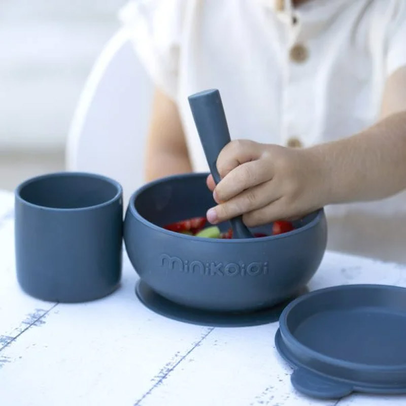 Un coffret premiers repas idéal pour offrir ! Ce joli coffret repas est composé d’un bol en silicone avec base anti-dérapante et son couvercle (pour garder le repas bien au chaud ou conserver les aliments au réfrigérateur), une cuillère en silicone pour aider bébé à développer sa motricité fine et un gobelet parfaitement adapté pour les petites mains. Facile à nettoyer, le bol passe au four (max. 200°C) et au four micro-ondes (sans le couvercle).