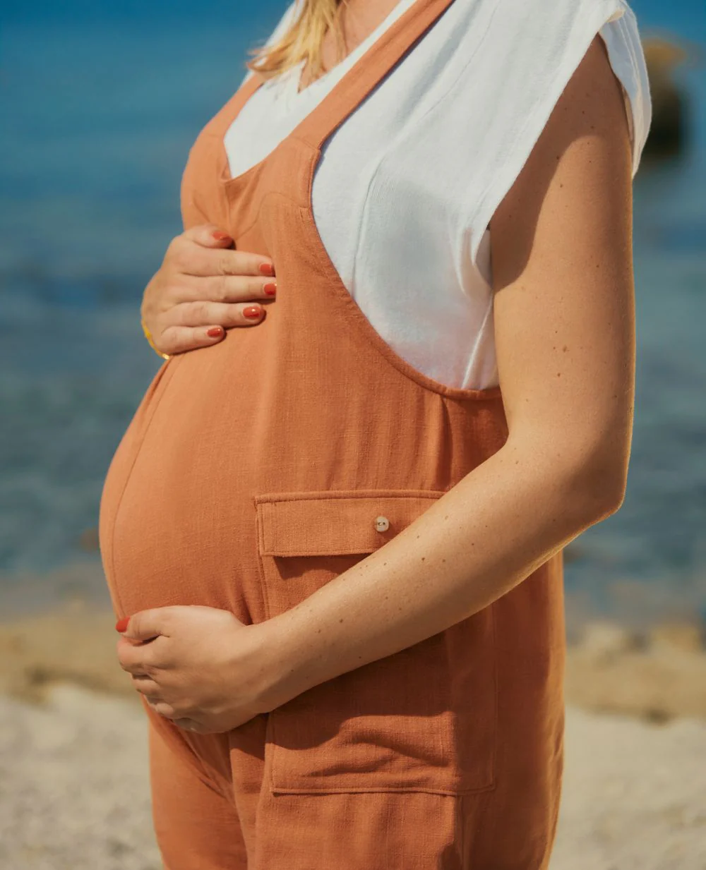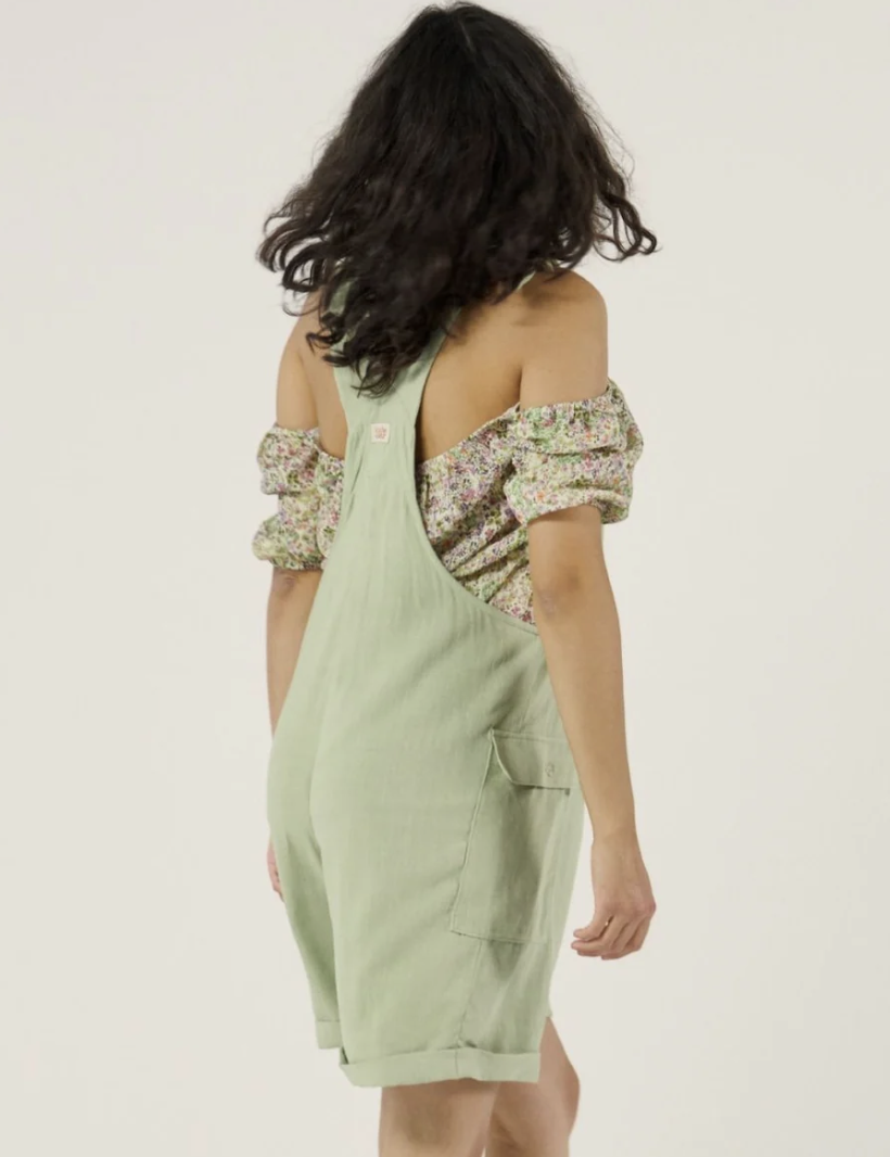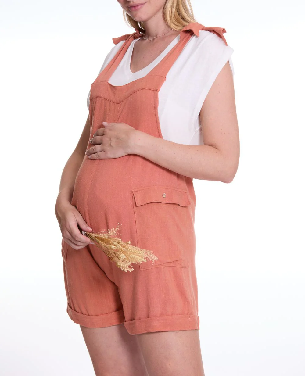 La salopette short de maternité Éloïse allie praticité et éco-responsabilité grâce à sa matière nid d’abeille en coton 100% biologique certifié GOTS.