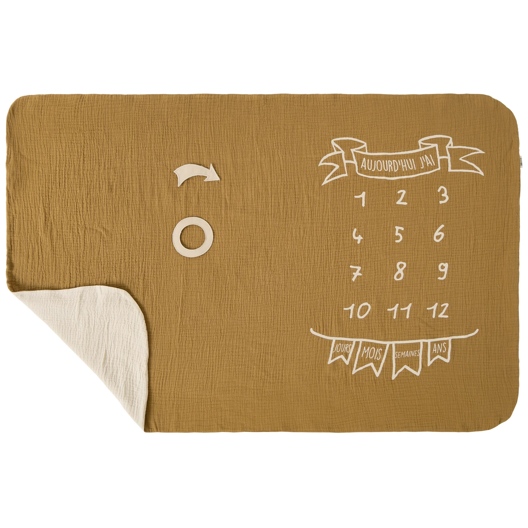 La couverture parfaite pour faire de jolies photos souvenirs ! Composée de deux couches de double gaze de coton, cette couverture magique offre deux utilisations : côté pile, c’est un joli plaid léger pour bébé, côté face, c’est un décor pour prendre bébé en photo à chaque étape de son développement ! Chaque couverture est livrée avec deux accessoires en tissu (une flèche + un anneau) pour mettre en avant les informations adéquates au moment de la prise de vue. Couleur : havane & biscuit, Dimensions: 110 x 75 cm.