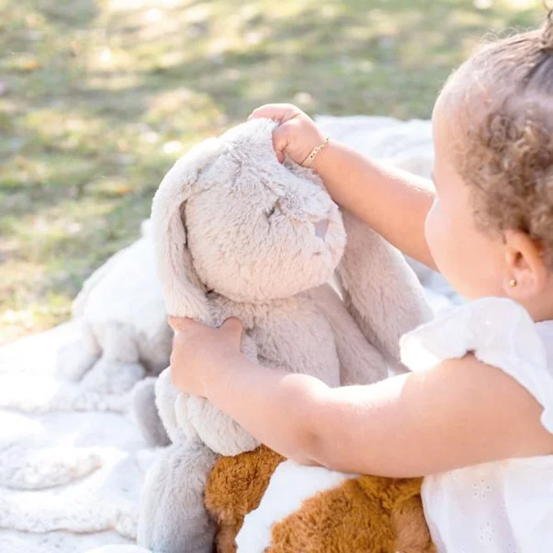 Une peluche ultra douce à câliner ! Ce joli lapin d’une irrésistible douceur est fabriqué avec amour avec des matériaux durables et de qualité en suivant un processus de fabrication équitable et socialement responsable. Ses bras, jambes et ventre sont lestés pour assurer une meilleure tenue et permettre une position assise. Hauteur : 40 cm.
