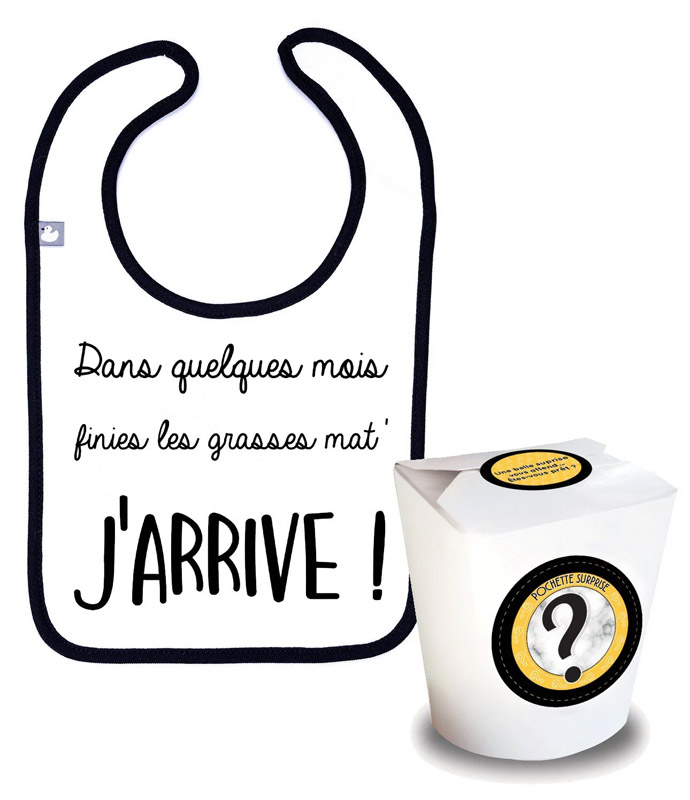 Les plus belles annonces méritent les plus jolies surprises ! Vous souhaitez annoncer votre grossesse à votre entourage de manière ludique et originale ? Offrez-leur une pochette surprise et laissez un souvenir impérissable ! Chaque boîte mystérieuse contient un joli bavoir en pur coton à message pour faire votre annonce. Vous pourrez ainsi l’utiliser plus tard avec bébé ou le conserver en souvenir. Bavoir en 100% coton.