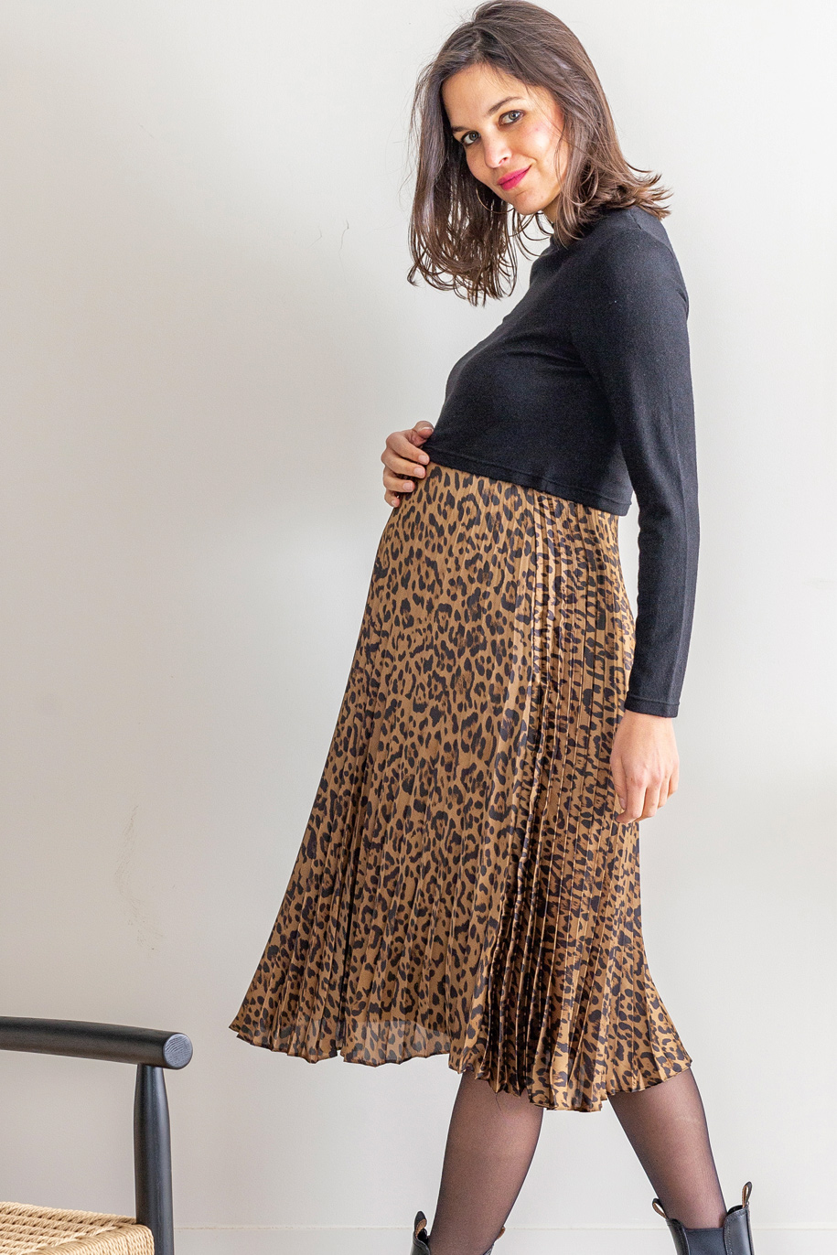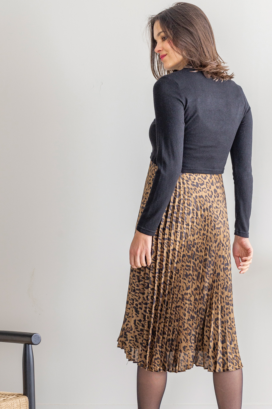 C’est la nouvelle robe chic bimatière dans un bel imprimé léopard, pour du style cet hiver!