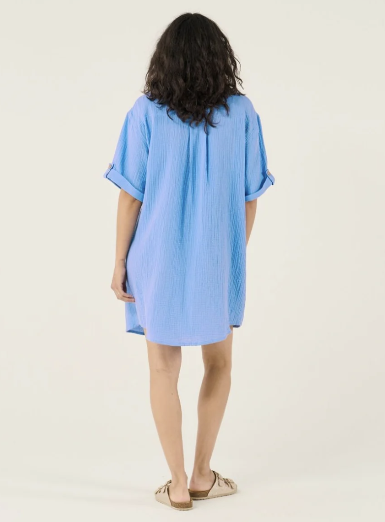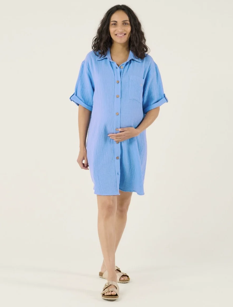 La robe chemise de grossesse et d’allaitement Bertille Corail allie légèreté et éco-responsabilité grâce à sa gaze de coton 100% biologique certifiée GOTS.