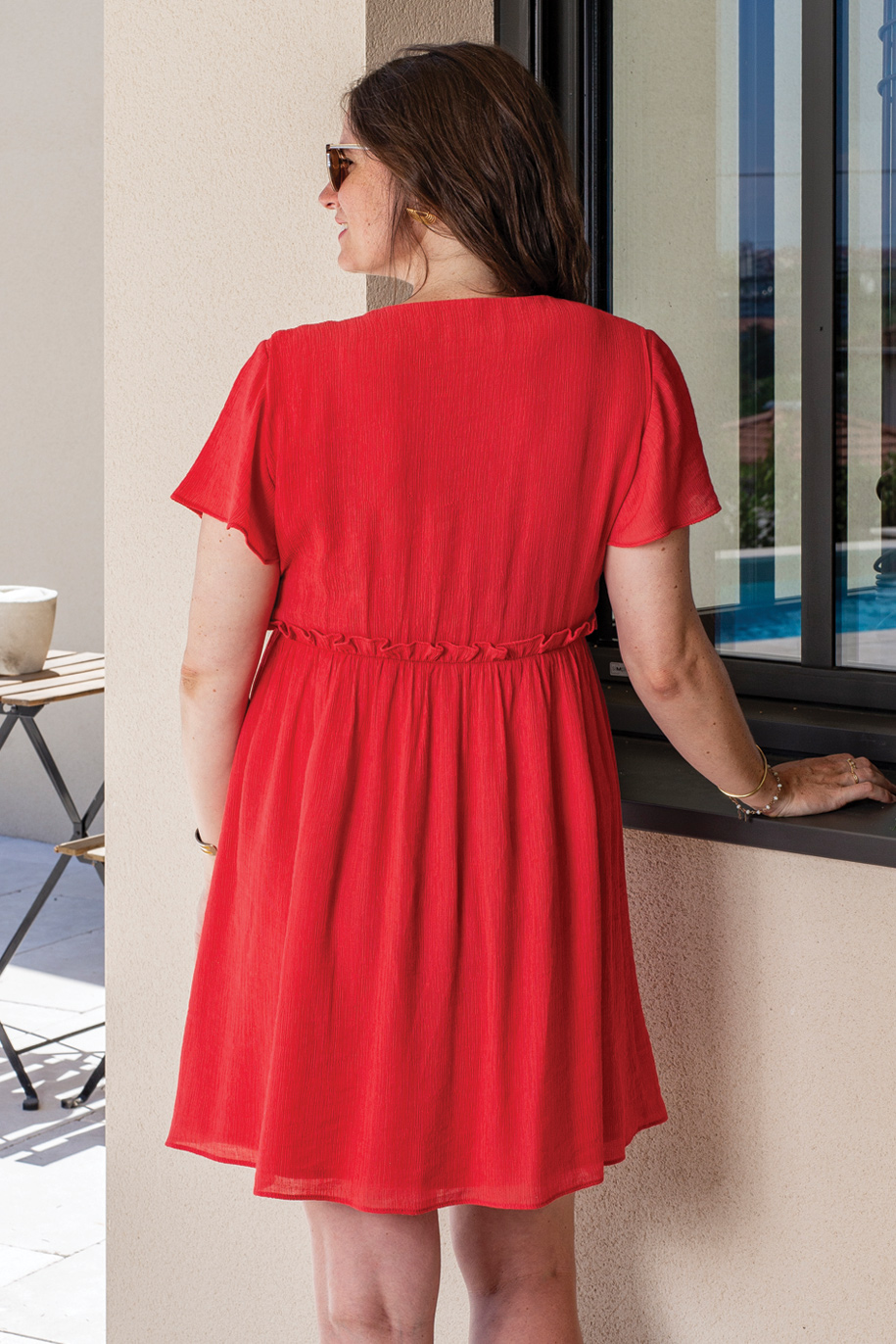 Découpe sous poitrine élastiquée avec petit volant.