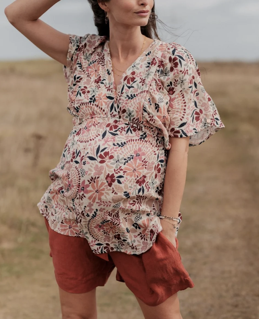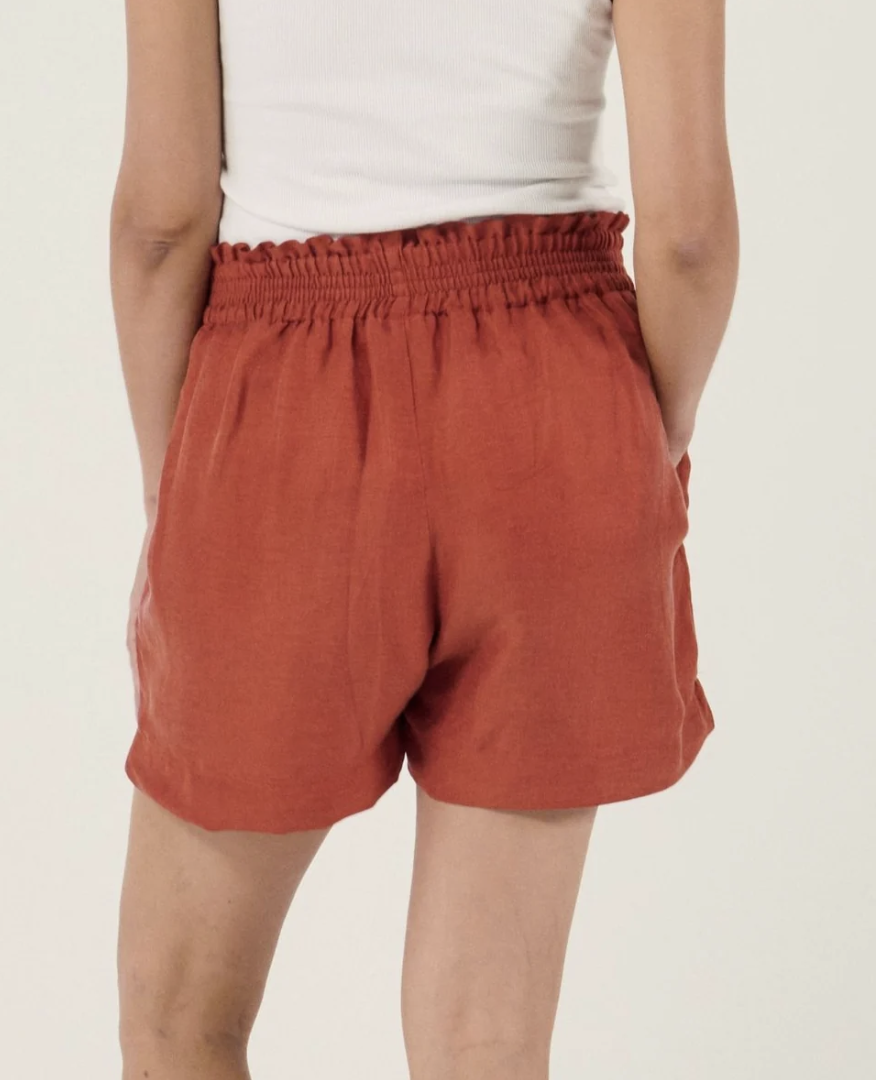Le short de grossesse Nubie Cuivre allie fluidité et confort grâce à sa matière twill Cupro Ecovero et sa ceinture élastiquée smockée.